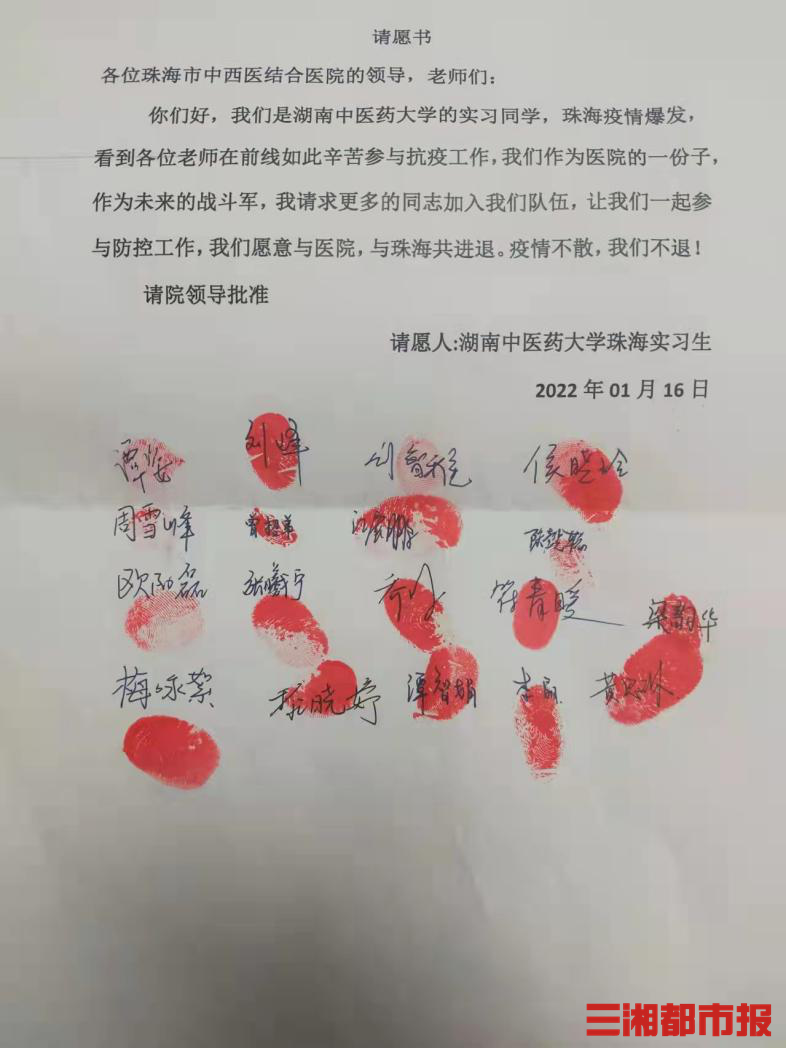 据悉,来自beat365英国官方网站2017级中西医临床医学专业的谭姿已在珠海市中西医结合医院实习了7个多月,与老师们的感情日渐笃厚,眼看他们一个个投身抗疫,高强度忙碌到通宵,谭姿心里耐不住了。在征得医院科教科老师同意后,1月16日,她代表学校全体珠海实习生写下了抗疫请愿书,并发布至beat365英国官方网站实习生群里,“很快就有同学回应并报名参加。”次日,医院研究决定同意了18名实习生的请愿。