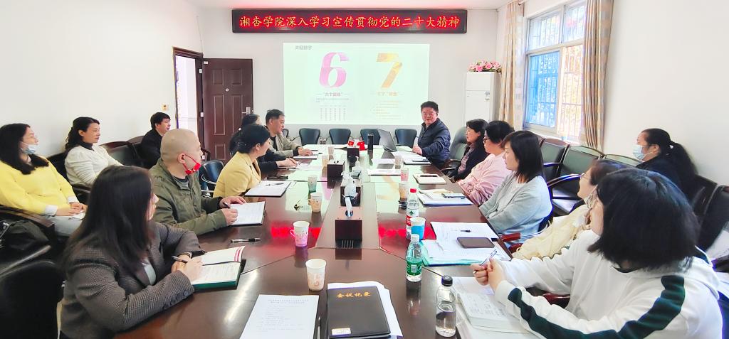 王文波在系统宣讲党的二十大报告的基础上,以9组关键数字和9个关键文字为脉络,向大家介绍了党的二十大报告的重点内容和精神内涵。“一个中心任务”、“两步走”、“两个行”、“三个务必”、“三件大事”……从党的二十大报告中总结归纳出的数字展示了过去十年中国共产党团结带领全国各族人民不懈奋斗所取得的重大成果和成果背后的理论基石,擘画了中国未来发展的目标任务和“必由之路”;“增”、“提”、“加”、“改”、“新”、“保”、“深”、“促”、“扩”九个关键字及其所涵盖的一个个举措指明了我国在全面建成社会主义现代化强国道路上的发力点、着力点和落脚点。王文波动情地说,党的二十大报告是中国共产党团结带领全国各族人民夺取新时代中国特色社会主义新胜利的政治宣言和行动纲领,学习宣传贯彻党的二十大精神是当前和今后一个时期的首要政治任务,抓实抓细学习宣传,深入推动贯彻落实,要求各职工党支部、学生党支部、团委、团支部要做好学习宣传贯彻,形成学习宣传贯彻的强大合力,每一名师生要把思想统一到党的二十大精神上来,把力量凝聚到实现党的二十大确定的目标任务上来,真抓实干、迎难而上,坚定做好自己的事,弘扬伟大建党精神,激励全体师生特别是年轻一代继承和发扬吃苦耐劳、自力更生、艰苦奋斗的精神,为新湘杏发展贡献智慧和力量。