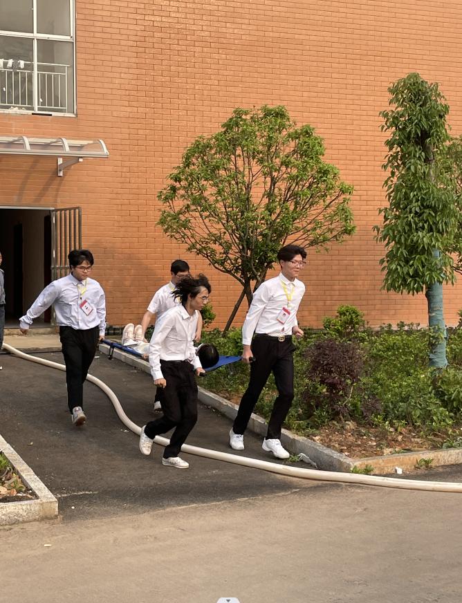 在王书记宣布演习正式开始后,各小组迅速进入紧急状态。本次消防演习以5号学生公寓5楼起火为背景,在通讯组成员燃放烟雾弹后,警报组立即拉响警报。保卫部接到火情报告后,第一时间向学校主管领导报告火情,并启动应急预案,成立现场指挥部指挥救援工作。灭火组消防值班员接警后,立即启动消防栓,并向5号楼着火点冲水;疏散组引导师生从疏散通道有序撤离,同时观察每个寝室是否还有被困人员;医疗组及时转运受伤的同学。消防疏散演习在各小组成员有条不紊的工作中圆满完成。
