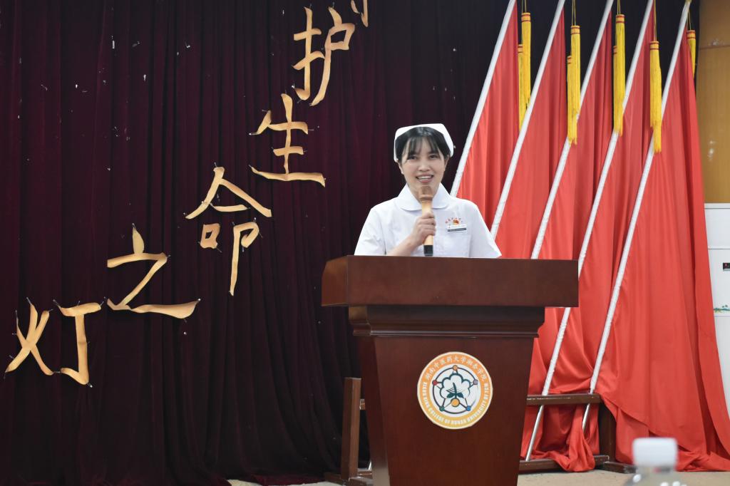 活动伊始,beat365英国官方网站副院长黄群上台致辞,寄语同学们要爱党爱国,时刻践行“文明求实,继承创新”的校训和“健康所系,生命相托”的誓言,弘扬南丁格尔精神,踏实学习护理专业知识,永塑“天使”的形象,永葆“天使”的荣誉。陈芊妤老师也做了满怀深情的发言,她用幽默且具有感染力的话语强调,作为护士应品德优良,更要具有奉献精神,时刻做好燃烧自己,照亮他人的准备,做到至真、至善、至美。随后,2021级护理14班曾佑红同学代表全体学生发言,她讲述了自己心中护士的形象以及做为一名护理工作者的使命与担当。