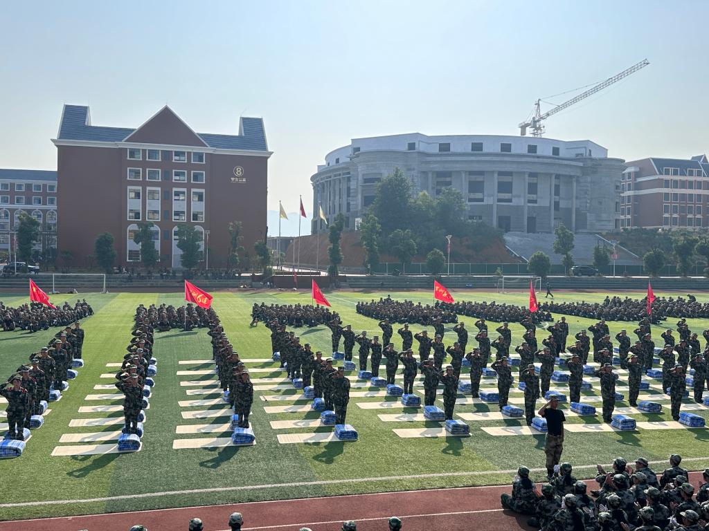 升旗仪式结束之后汇报演出正式开始。首先2024级同学们进行了文化方阵表演。他们团结一致,伴随着朗诵和口号声,同学们摆出了工整的汉字与逼真的图案。铿锵有力的检阅进行曲奏响,标兵就位,分列式开始。气势磅礴的口号、刚劲有力的摆臂、整齐划一的步伐,15个连队以一种奋发向上的姿态,沿着阅兵道依次走过主席台。每一个动作都力求完美,每一个步伐都充满力量。随后新生们进行了整理内务方队、头顶水瓶方队以及持枪战术方队的表演。充分展现了十多天刻苦训练的成果和新时代大学生的朝气和坚毅,赢得现场师生的阵阵掌声。