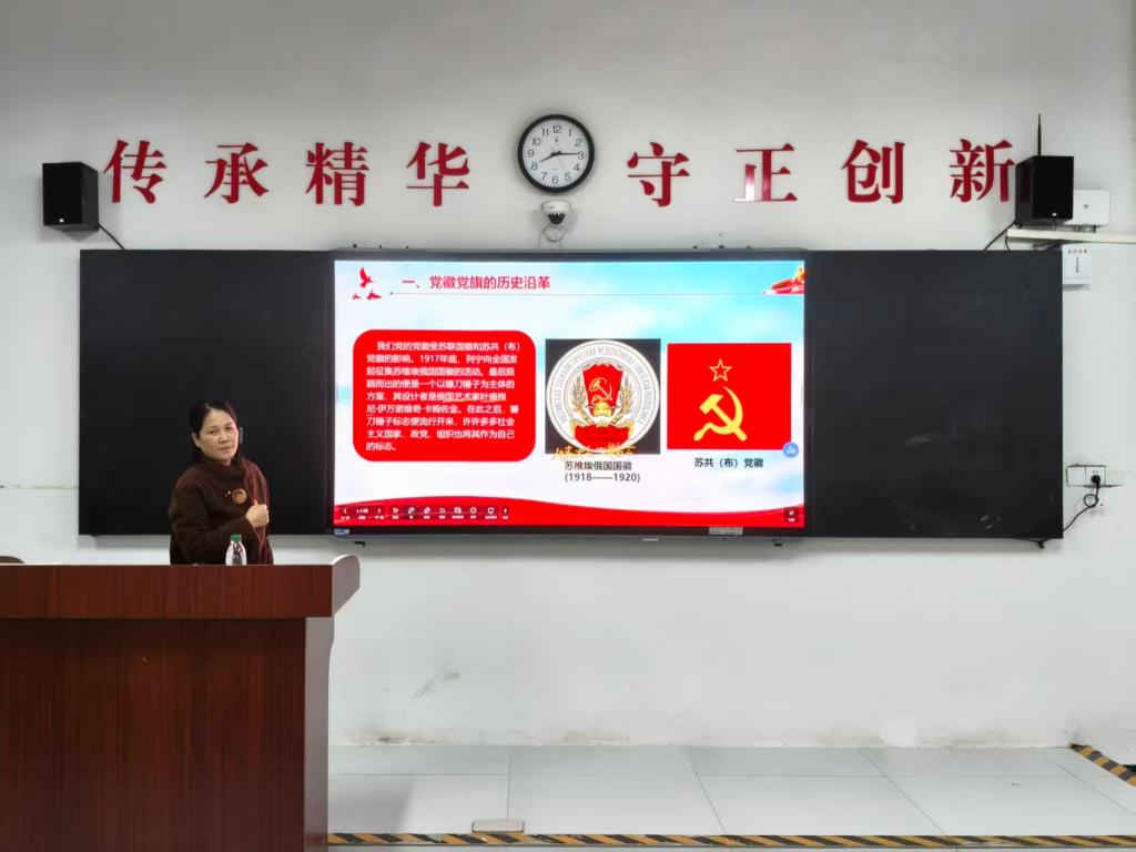 第二节党课聚焦《中国共产党党徽党旗基本知识学习》,谢辉院长以党徽党旗百年演变为主线,生动展现中国共产党从萌芽到成熟、从弱小到强大的奋斗历程,强化入党积极分子对党的象征与标志的政治认同。
