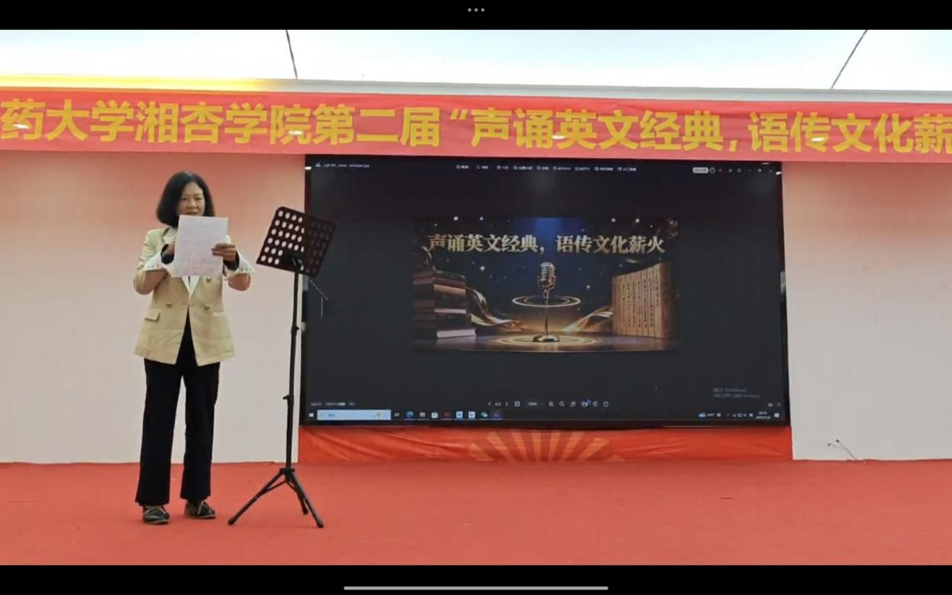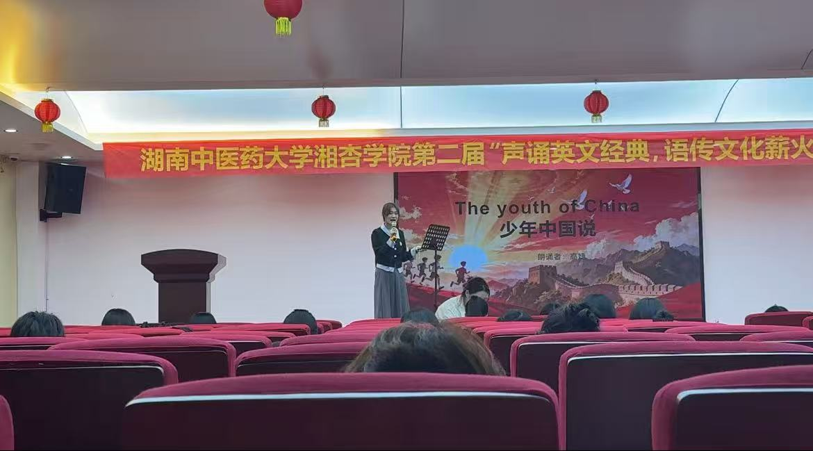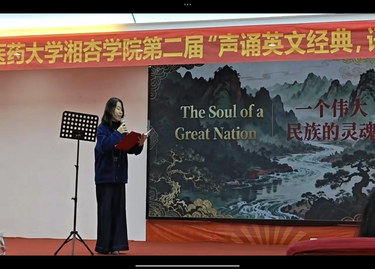 经过班级选拔、院级初赛的层层筛选,最后12组选手凭借他们扎实的语言功底、饱满的情感表达成功晋级决赛。在决赛现场,选手们围绕“青春逐梦”“文化传承”“时代担当”等主题,带来了风格各异的朗诵作品。既有《Youth》《The soul of a great nation》等巧作的深情演绎,也有结合中医药文化特色的英文篇章,还有将传统智慧与现代英语表达巧妙融合,充分展现了我们湘杏学子的多元素养。
