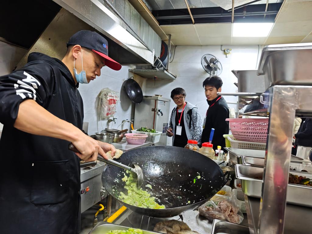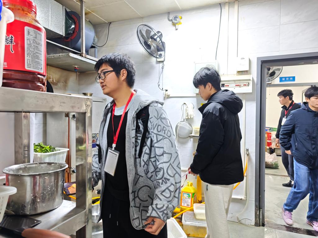 进入食堂后,监督队伍首先来到一楼炒菜区域,成员们近距离查看食材加工、菜品烹饪、餐具消毒等关键流程,仔细核查食材新鲜程度、厨师操作规范及厨房卫生状况,并围绕菜品留样、控油控盐等细节与工作人员深入沟通——现场提出的疑问均得到耐心解答。随后,队伍前往二楼食材仓库,重点检查米、面、油、调味品等食材的保质期、外包装标识及存储环境,确认食材分类存放、防潮防虫等措施落实情况,全面排查潜在食品安全隐患。