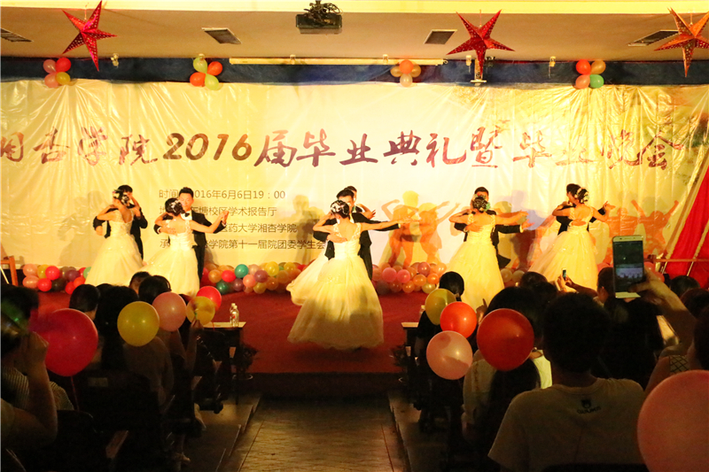 毕业典礼结束后,街舞队热舞《水深》成功将现场气氛点燃,引来现场阵阵欢呼,毕业生晚会正式开始。由传统保健队带来的《导引雄风》刚柔并济,引起了中医学子们的强烈共鸣;舞蹈《时间都去哪了》、《博物馆奇妙夜》、《赤道与北极歌曲串烧》、歌曲串烧《致青春》展现出了大学生的青春与活力,掀起了现场一阵又一阵的热潮;小品《恋爱倒数》引起了现场情侣们的共鸣。最后,学生会带来的舞蹈《给力青春》再次给观众展示了湘杏学子的青春活力。至此,晚会圆满落幕。