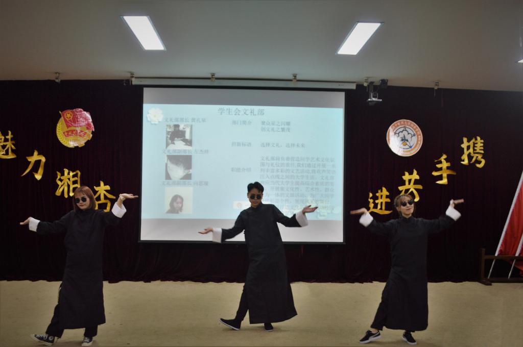 活动伊始,主席团成员一展歌喉,与新生互动歌唱,招新宣传会迎来阵阵掌声。余温未退之际,精美幽默的招新视频引得台下阵阵喝彩。宣传部的国画与书法表演透露出该部门深厚的书法绘画功底;体育部传统保健队的舞蹈《江上清风游》,典雅矫健;外联部的开朗大方展现出捭阖纵横的气度;文礼部的《桃花朵朵开》,文在气质,礼在仪表;广播站以声会友,用声音传递着信息,连接我们与世界的距离。在各部门及协会精彩的宣传表演后,新生们积极热情的参与现场报名。