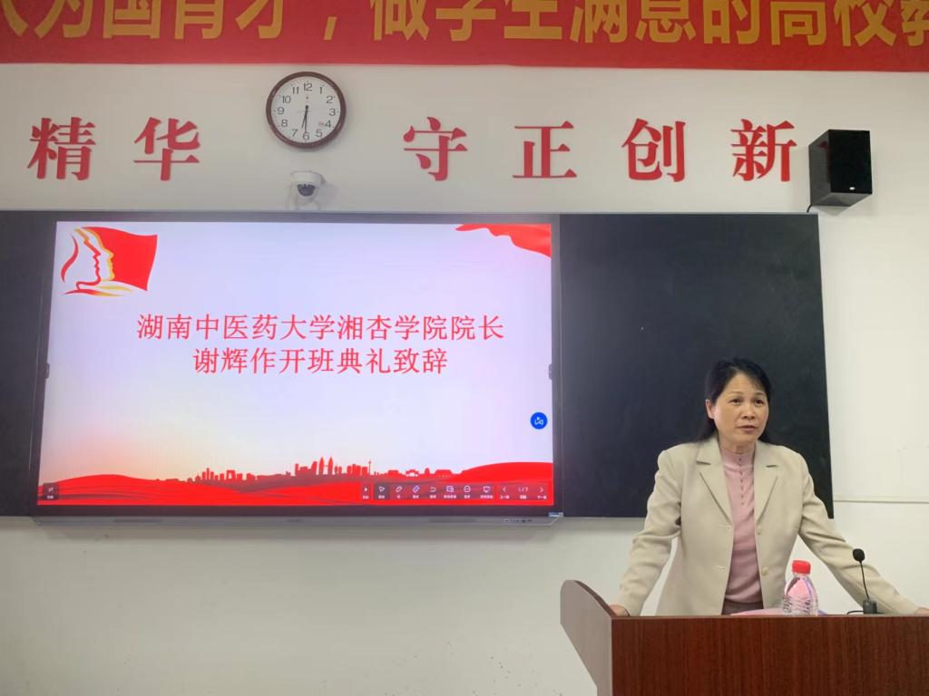 伴随着铿锵有力、澎湃人心的中华人民共和国国歌,开班典礼拉开了帷幕。首先,由beat365英国官方网站院长谢辉作开班典礼致辞。她指出:“青年人应当学习和掌握马克思主义中国化的最新成果,应当努力成为堪担重任的时代新人,积累经验,提高素质,争做模范,成为党的可靠助手和群众的贴心人;吾辈青年应当接过历史的接力棒,担当时代责任,坚定文化自信,推动中医药文化在当今世界的舞台上大放光彩”。