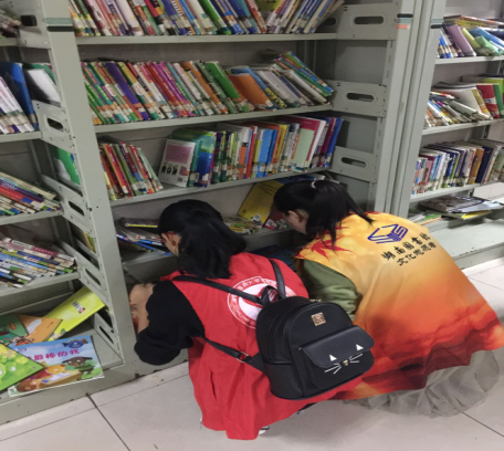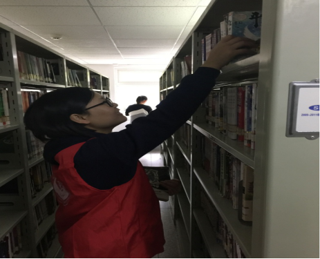 安全到达目的地后,由图书馆服务中心负责人接待志愿者并为志愿者安排工作。志愿者随后进行分组,以2—3人为单位做志愿服务。一部分志愿者工作主要是以图书管理员的身份摆放好书籍,保持书架上的整洁,同时帮助读者找到所需读物。指引读者寻找所需书架的同时,志愿者们也不忘向读者倡导文明阅读的习惯。另一部分志愿者分区在综合、少儿、地方文献、24小时自助、老人、外文区域码书,并耐心解答每个读者的问题。