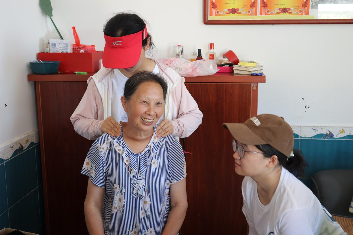 志愿者正在与邓运华奶奶亲切交流并推拿按摩(蒋湘珠摄)