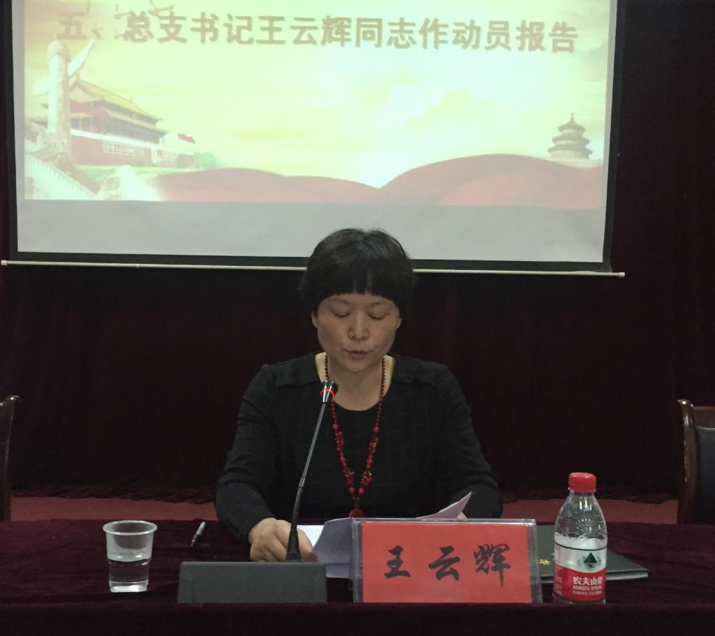 接着,王云辉同志作动员报告。她强调全体党员首先要深化思想意识,把握此次学习教育的意义。其次,要突出“两学一做”学习教育的重点内容,实行分类、分层指导。三是要强化问题导向,突出学习教育的针对性和实效性;四是要结合中心工作,实现两手抓两促进;五是要强化组织领导,从严从实推进落实。她强调:“学是前提、做是关键,学是牵引、做是目的,基础在学、关键在做的原则。坚持既学又做、边学边做,做到学、做两重视、互促进、相检验,知行全一,经世致用”。