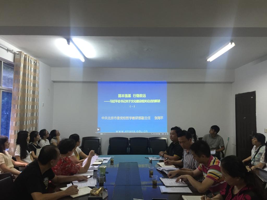 本次学习重点围绕习近平总书记关于文化建设相关论述进行解读,由北京市委党校哲学教研部张海平教授主讲。认真学习习近平同志关于正确对待中国传统文化的方法论思想,对于帮助我们正确理解和把握上述问题具有十分重要的意义和作用。在网络课程中,张教授从坚守我们的核心价值体系和核心价值观、弘扬主旋律、传播正能量、大力弘扬中华优秀传统文化、提高国家文化软实力、牢牢掌握意识形态工作领导权和话语权等方面,为我们做了深入分析和解读。此次学习不仅让党员们的思想意识有了进一步提高,也为学院开展“两学一做”活动营造了良好氛围。